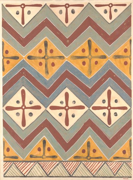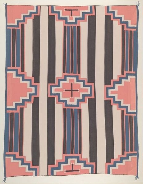Curator: Let’s take a look at "Plate 8," a textile print made by Louie H. Ewing sometime between 1940 and 1943. It’s a striking example of Indigenous American fibre art. Editor: It's unexpectedly vibrant! I’m immediately drawn to the boldness of the coral and the depth of that indigo. There's a real visual punch. It feels meticulously crafted. Curator: Right. Ewing's work engages with abstraction in really interesting ways, and it appears to draw upon established geometric motifs from weaving traditions of the Southwest, especially around Santa Fe. The use of what seem like stacked terraced steps evokes historical and cultural continuity. Editor: It makes you wonder about the labor involved, doesn’t it? Creating something like this, the hands that chose these colors, that guided the fibers… you can see the immense skill and patience woven directly into the piece, quite literally. What kind of access to material would Ewing have had, what restrictions were present at the time it was created? Curator: That's an important point. The work was made during a time when Indigenous art was gaining recognition within the art market, and there was significant focus on maintaining "authenticity.” While it is recognized today in part due to such historic attention, this raises issues around how Indigenous artists were positioned, collected, and exhibited within larger cultural institutions at that time. Editor: Absolutely. I see those diamond shapes containing tightly regimented blue stripes almost as windows – a look through which to better consider this art as labour. The question of ‘authenticity’ that you raise highlights the complexities faced by artists making work during these periods. Curator: I agree. This "Plate 8" acts as more than just an appealing aesthetic. It opens conversations about cultural heritage and the creative process itself. Editor: Exactly, reflecting on the labour and the act of artistic expression through a range of social structures ultimately deepens one's understanding of what is presented before you. Curator: So true; its power lies in its intersections of aesthetics and cultural history. Editor: I am left struck by Ewing’s sophisticated rendering of traditional designs into this striking modern piece.