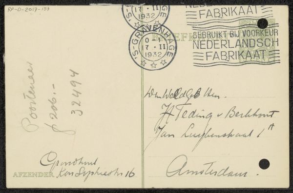 Editor: So, this is "Briefkaart aan jonkheer Hendrik Teding van Berkhout," a postcard to Squire Hendrik Teding van Berkhout, possibly from 1932 or '33, by Henri Verstijnen. It's ink on paper, really delicate. I'm struck by how personal it feels, like a glimpse into a very specific moment in time. What stands out to you about it? Curator: Ah, yes, a postcard - whispers carried across time. You know, to me, it's more than just ink on paper, it’s a portal. See the hand-lettering, how each flourish hints at the personality of the sender? This isn't just a message; it's a tiny performance. Imagine Verstijnen, carefully crafting each letter, choosing each word to make his mark. Have you ever written a postcard with such intention? Editor: Not really, I usually just scribble something quick! I never thought about it as a performance. It seems like he's writing to someone important, a director? Curator: Exactly! The *jonkheer*, the director of the print room – these details paint a picture of a cultural landscape, a network of artists and patrons. It's fascinating to consider what this brief card might have contained – perhaps a query, a thanks you, or a gentle nudge, hinting at professional or social nuances of that time? Do you get that impression, too? Editor: Definitely, it feels very formal but still friendly, almost intimate somehow. It also has some art/sketchbook qualities, it looks very artsy in some way. Curator: I think you’ve hit it on the nose! Imagine finding this treasure in someone’s attic. Editor: It’s definitely given me a new appreciation for the art of letter-writing! Curator: Indeed, a forgotten art, wouldn't you say? Perhaps this inspires us both to slow down, pick up a pen, and craft our own tiny performances on paper.