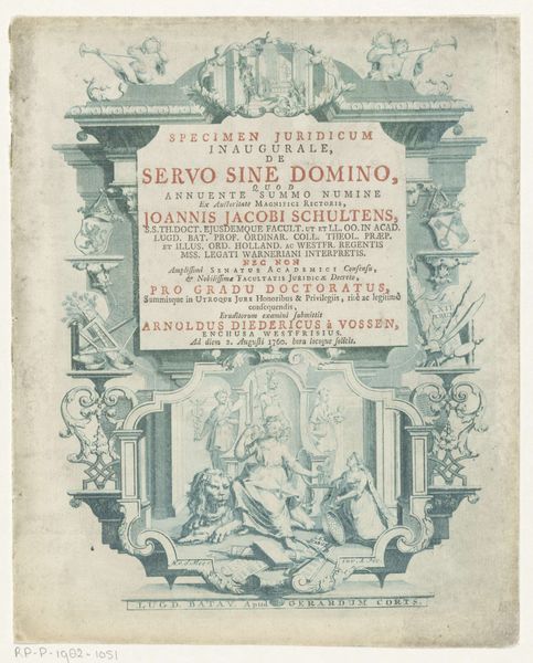 Editor: So, this print is titled "Rechtvaardigheid zittend op de Hollandse leeuw" made in 1741 by Noach van der Meer the First, currently residing in the Rijksmuseum. I’m immediately struck by how this rather conventional bookplate teems with allegorical figures; it almost feels like a stage. What story do you think this image is trying to tell? Curator: Well, notice how the lion, a traditional symbol for the Dutch Republic, serves as a grounding force. Justice sits atop this lion, holding scales and a sword. Consider the implications—what does it mean when Justice, a concept already laden with symbolism, is literally and figuratively supported by national identity? What prior imagery informs the way we, and those in 1741, perceive those scales and sword? Editor: That’s a great point! It’s interesting to think about the context of its creation. Does the imagery draw from previous artwork of the era, or even earlier, perhaps ancient iconography? Curator: Absolutely. The iconography has roots reaching back to classical antiquity. The seated figure of Justice recalls images of Roman goddesses. Even the cherubic figures overhead are a clear nod to Baroque artistic conventions. Think about how the artist is intentionally invoking a specific visual language, tying contemporary ideas about Dutch sovereignty to a longer history of power and authority, even embedding christian themes in a largely secular item. What assumptions do you think they were making about their audience? Editor: That this audience, steeped in both classical and religious tradition, would immediately recognize and understand the symbolic connections being made. Almost like a visual shorthand for power. Curator: Precisely. The longevity of these symbols across vastly different cultures and eras highlights how images act as vessels of collective memory, shaping and reinforcing cultural values. Editor: This engraving makes me appreciate the power of images and symbols to shape identity! Thanks for your insights. Curator: My pleasure! Analyzing symbolic languages enriches our comprehension, both of the artwork and ourselves.