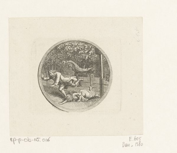 Editor: So, this etching from 1787, Daniel Nikolaus Chodowiecki’s *Medea omhelst haar kinderen, waarna ze hen met een dolk doodt* – Medea embracing her children before killing them with a dagger – is intense! It's got this claustrophobic feel with the figures pressed into a small circle. What do you make of it? Curator: Ah, yes. It’s interesting, isn’t it? Chodowiecki's choice of framing really enhances the drama. But beyond the obvious horror of the infanticide, I see a heart-wrenching portrait of a woman cornered, driven to extremes by betrayal and societal constraints. Have you ever considered how much control women had at the time? It's all about the loss of control, the desperation. A dreadful twist on motherly affection. Editor: That's a completely different take than I was expecting. I was just focused on the…you know, the horror. Curator: Isn't it often the case? Art throws our prejudices back in our faces and whispers something deeper. Look at Medea's embrace – is it purely sinister, or does it contain a trace of maternal love even in this moment of madness? Perhaps she saw it as an act of control, protecting them from a life of possible vengeance and hardship? Editor: I never thought of that. It does change how you view the work. I guess there's more to baroque art than dramatic lighting and sharp edges. Curator: Absolutely! It's a portal into the messy realities of human experience. Always challenging and usually much to contemplate. It makes me want to revisit other versions of Medea now. Editor: Yeah, I'm seeing that now! Thanks for the insights!