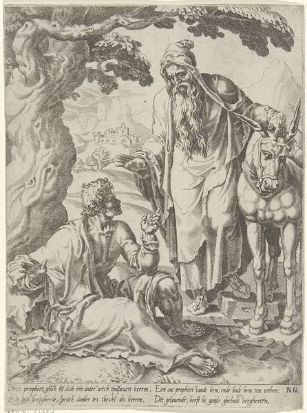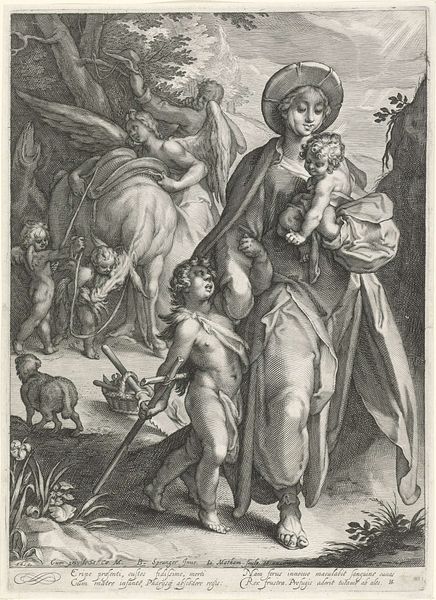 Editor: Here we have Raffaello Schiaminossi's "Rest on the Flight into Egypt," an etching, likely from the late 16th or early 17th century, found at the Harvard Art Museums. It feels both intimate and staged. What story does this print tell us about the perception of the Holy Family at the time? Curator: It's interesting to consider how this print contributes to the evolving visual narrative surrounding the Holy Family. Think about the socio-political context of the time – how did religious institutions and patrons shape the depiction of biblical scenes for public consumption? Were these images primarily devotional, or did they serve a broader purpose? Editor: I hadn't considered how much power the church held in dictating the visual narrative. I guess I always viewed it as a straightforward biblical story. Curator: Exactly! Examining art within its historical framework reveals the complex interplay between faith, power, and artistic expression. It reminds us that images are never neutral; they reflect and shape societal values. Editor: I’ll never look at religious art the same way again. Thanks!