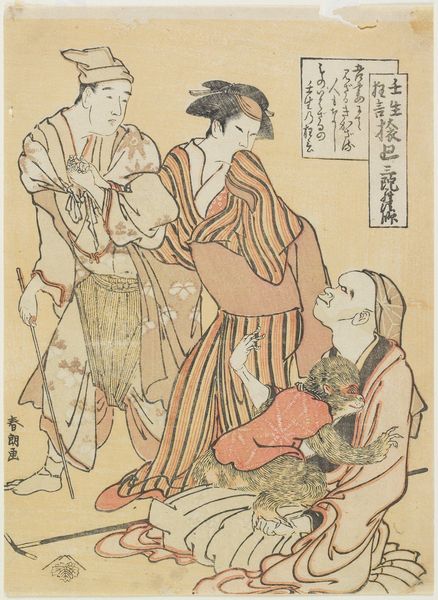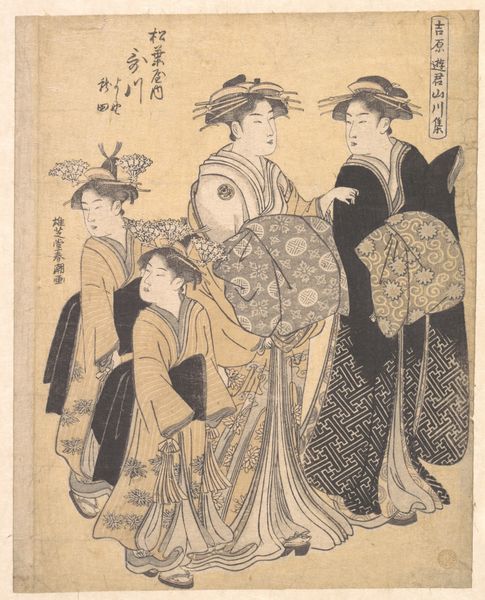 Curator: This woodblock print by Torii Kiyonaga, created around 1790, is titled "A Woman and Two Maids, from the series 'A Mirror of Feminine Manners'". It's currently part of the collection at the Art Institute of Chicago. Editor: It evokes such a sense of tranquil refinement. The subtle gradations in color, the delicate lines... there's an airiness to the whole piece that immediately draws me in. Curator: Exactly. The composition reflects a deliberate understanding of class dynamics within the context of Edo period Japan. The central figure, likely a woman of higher status, is flanked by her maids, which serves as an entry point to a commentary on societal structure and gendered labor. Editor: And the kimonos themselves – what striking textile design. Consider the way the fabric drapes and folds; the labor in the cultivation of silk, the dyeing processes, the construction of the garments. This work is materially rich. Curator: Absolutely. The layering of fabrics and the different patterns on display underscore the complexity of female presentation and identity at the time. Note how each character occupies a distinctive space within this representation of idealized feminine behavior. Editor: There’s a palpable intimacy within these processes and these relations, but also, one cannot escape the system of production behind these materials. The unseen labor propping up this world of aesthetics. Curator: The piece resonates even now, because the negotiation between labor and leisure is never easy, and the material comforts we find are not distributed equally. Editor: I agree; tracing that history through artworks offers such compelling and urgent insight into our present-day reality. Curator: Thinking through gender, labor and visual culture helps unlock such important reflections on past lives but, indeed, our shared experience too.