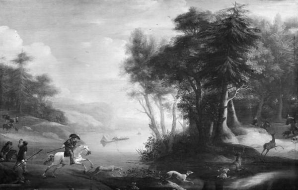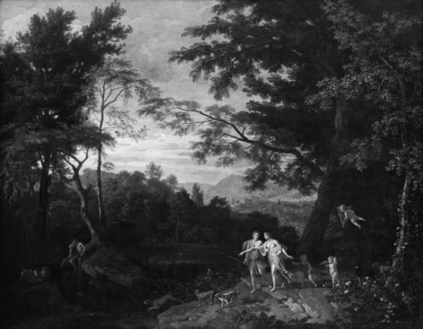 Editor: Right now, we're looking at Alexander Keirincx's "Wooded Landscape" from somewhere around 1615 to 1620. It's a painting, and what strikes me most is the dense, almost claustrophobic feeling despite being a landscape. What draws your eye when you look at it? Curator: You nailed the immediate sensation, it's interesting to feel squeezed by a landscape, isn't it? My gaze keeps getting snagged by the contrast between the leafy details, rendered in subtle shades, against the mysterious dark thicket beyond. It's as though Keirincx is pulling back the curtain on something secretive. And then, there are the people... Where do you think they might be headed? Editor: Hmm, good question. Honestly, they seem a little lost. Maybe heading to the forest’s edge for wood? Curator: Lost or simply wandering… Back then, wilderness held a very different meaning. It wasn’t just pretty scenery; it was a place of potential danger, adventure, even spiritual encounters. Those figures, positioned at the painting's heart, become these vulnerable, human-sized measures in the landscape's drama. Look how small they are, they look even smaller than the tree stumps! It's all mood. Don't you just love it? Editor: I see what you mean, that sense of scale makes them look exposed and quite vulnerable. It reframes the monochrome effect, and creates a real feeling of something slightly dangerous, almost romantic, about being swallowed by the landscape. Curator: Exactly! Almost like being pulled back into yourself by being dwarfed against a huge universe! It invites a kind of pensive reflection about where *we* fit into the bigger picture. Thanks, I'm ready for a wander in the forest myself. Editor: And now I understand the thrill of forests of the 17th century! It's a journey inward *and* outward, simultaneously.
