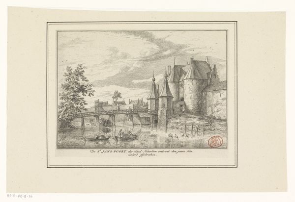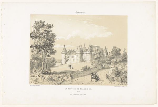 Editor: This etching, "View of Bentheim Castle from the West" by Louis Thümling, dating from around 1831 to 1843, really evokes a sense of Romantic grandeur. The castle dominates the landscape, but there's a sense of quiet observation with the figures in the foreground. What sort of symbolic readings can we find in this landscape? Curator: I see a fascinating interplay between nature and civilization. The castle, perched atop the hill, represents power, history, and the enduring presence of humankind. Notice the contrasting textures - the meticulously etched stones of the castle versus the wild, almost chaotic lines describing the surrounding foliage. Does this contrast reveal anything about the artist’s intentions? Editor: It almost seems like nature is encroaching, softening the imposing structure. Are those figures in the foreground pilgrims, or simply passersby? Curator: Their small size emphasizes the vastness and timelessness of the landscape. Their presence could symbolize humanity's relationship to history, perhaps our transient existence against the backdrop of enduring structures. Think about how the castle itself, as a cultural symbol, would have resonated with viewers in the 19th century. What emotions would it evoke? Editor: Maybe a sense of national pride, or nostalgia for a romanticized past? Curator: Precisely. And consider the use of light and shadow. The dramatic lighting accentuates the castle, drawing our eye upwards. Light symbolizes knowledge, but shadows hide many things, allowing the castle’s image to grow, to transform in our minds. It can carry collective cultural memory but it’s also being made anew for each of us. Editor: So, it's not just a picture of a castle; it's about how we relate to history and the power of place? Curator: Indeed. The artist uses the castle as a symbol to unlock deeper feelings about heritage, time, and the human condition. The icon invites reflection on what we preserve from our past and how it shapes our present. Editor: That really changes how I see the piece. It’s a lot richer than just a pretty picture of a castle. Curator: Seeing those symbols and interpreting them enriches how we connect to artworks across time, place and cultures.