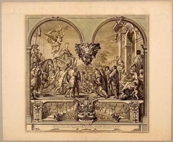 Curator: Here we have Friedrich Eduard Eichens' "Adoration of the Kings," a print held here at the Harvard Art Museums. What leaps out at you? Editor: There's such an intricate layering of images, so many figures packed into one space. It reminds me of a medieval tapestry, but with a kind of reserved, classical feel. Curator: You’re right, the image, and its border, are overflowing with symbolism. Look at the angels, for instance. Editor: Yes, hovering above, but also the border decorations, cherubs and floral motifs—echoes of divinity and earthly life all intertwined. Curator: Notice how the kings' gifts aren't merely offerings but symbols of kingship, divinity, and sacrifice. It is a cultural memory of the scene. Editor: That's such a beautiful way to read it, seeing the gifts as these potent symbols, and now I can’t help but think about the weight of history. Curator: It's as though Eichens wanted to pack as much meaning as possible into every detail. Editor: Well, it certainly makes me feel like I’ve only scratched the surface, doesn’t it?