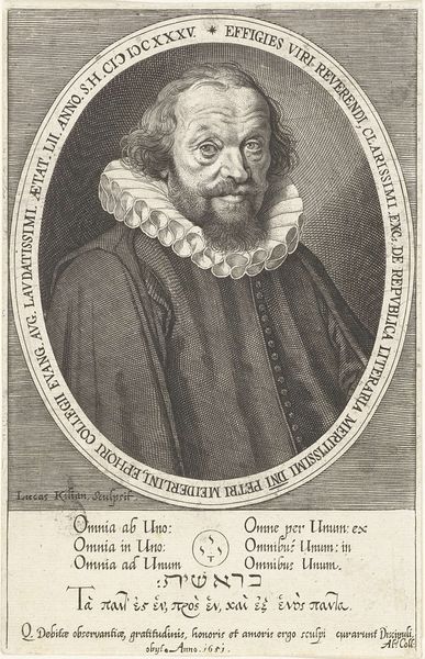 Curator: Here we have Lucas Kilian’s portrait of Peter Meiderlin, also known as Rupertus Meldenius. It’s a charcoal and pencil drawing dating from between 1590 and 1635. Editor: He looks rather… severe. There's an intensity to the gaze, wouldn’t you say? Almost unsettling. Curator: I would describe the handling of light and shadow as masterful. Note how the light falls across the face, emphasizing the textures and contours of the skin. This is classic Northern Renaissance portraiture, concerned with rendering minute details. Editor: It also strikes me as an image steeped in its time. The high ruff, the sober dress… it speaks of a very particular social standing. I'm curious about his role within the religious and political conflicts of the era, given his name "Meldenius," so maybe his stance in the theological disputes is shown in this work? Curator: His clothing signifies a certain austerity and refinement, aligning him with the upper echelons of society. There is such delicate precision and clean lines, indicative of the artist's mastery over his materials. Editor: Though austere, there's something about the gaze that suggests a challenge. His portrait is, beyond a depiction of an individual, a symbol of power and religious tensions and it makes you want to wonder and seek for more about the portrayed and the maker as well. Curator: I agree that this work encapsulates more than just physical appearance; the skill with which Kilian worked suggests the sitter was someone of considerable importance. Editor: Portraits like these remind us that identity isn’t fixed but created and re-created across history. His name could mean several important implications to the beholder who views this artwork at that period. Curator: Well said. It demonstrates the fascinating way form and content can intersect, inviting layers of contemplation. Editor: Precisely! And it is that kind of detail we should bear in mind, understanding history and representation when we see these magnificent displays of time periods and artwork.