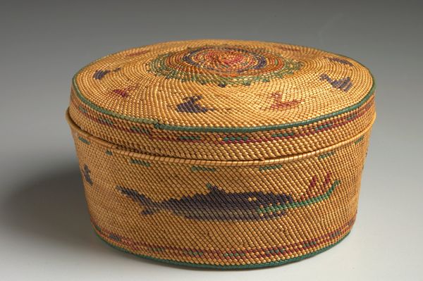 This small basket was woven by Qwiqwidicciat of the Makah people. The overall effect is one of intricate texture and considered design. The eye is immediately drawn to the lid. The basket is constructed with precise, tightly woven fibers forming geometric patterns. These patterns bring a rhythmic and tactile dimension to the piece. The lid features a captivating spiral design in earth tones and subdued blues and yellows. This motif contrasts with the base, where geometric shapes create a band around the basket's perimeter. The choice of natural materials emphasizes the basket's connection to its environment and the cultural practices of the Makah people. The overall form of the basket is not merely functional but serves as a canvas for cultural expression. Through its structure, the basket communicates complex ideas about the relationship between the Makah people and the natural world, reflecting a deep understanding of material and form as a language of cultural identity.
