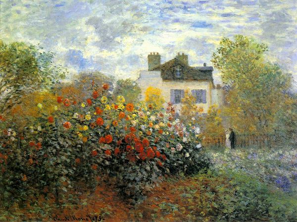 Curator: "The Steps at Vetheuil," painted by Claude Monet in 1881. An oil-on-canvas impressionist garden scene, brimming with light. What leaps out at you? Editor: Joy. Utter joy. It's like a pathway directly into summer's heart. I imagine walking up those steps with bare feet! Curator: Consider how Monet directs our gaze. The steps themselves, though central, aren't merely a pathway. He employs a narrow depth of field and layered brushstrokes that flatten perspectival space, emphasizing the composition. Editor: Flattening...Interesting. So the steps aren't so much "inviting" us up, as "presenting" the idea of a climb? It is about the color and light, then...like the sunshine itself is material. Curator: Precisely. See how the sunflowers create visual anchors on either side of the staircase, leading to the rooftop, hinting at more beyond? Editor: It almost feels voyeuristic! Peeking into someone's private garden. You know, I bet that little red-roofed house has amazing secrets. Curator: Perhaps Monet's point wasn't secrets, but the ephemeral nature of moments. These rapid strokes and unblended colours show movement...fleeting light, blooming, fading. Editor: So it's less about *what* he's showing, and more about how we feel when we see it? That's quintessentially Impressionist, isn't it? He gives you brushstrokes like emotional breadcrumbs to your own unique interpretation. Curator: Agreed. Though I think Monet would resist overly romantic notions about his intent! He may have simply desired to capture how light shapes perception. The subtle asymmetry, those impasto blossoms practically exploding on the canvas… Editor: Exploding is a perfect word! They are loud with colour and light but also...temporary. Summer won’t last forever, these blooms will fade. So it's all about savouring what's glorious now. Right? Curator: A celebration of the fleeting now seems a sound takeaway. Monet uses such palpable immediacy, the way color becomes a visceral experience! Thank you for illuminating that aspect, so beautifully. Editor: Thank you for bringing the sunshine. Truly. I think my heart might bloom a bit, today, after that.