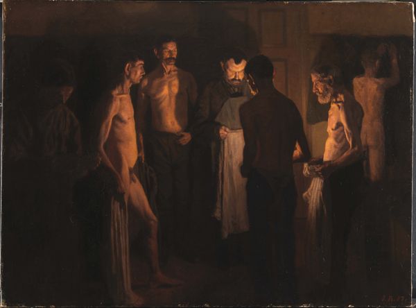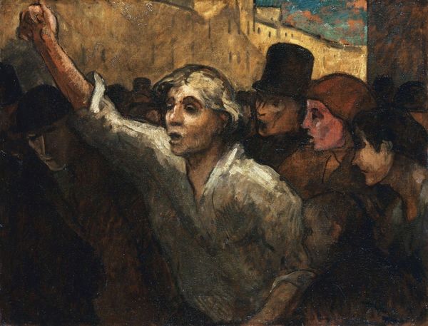 Curator: Looking at this painting, one gets a feeling that things are not so well. Editor: It feels like a smoky tavern scene, everyone tense. What's got them all wound up? Curator: This piece, created using oil paint, is called "The Strong Man", attributed to Honoré Daumier. It captures a very particular feeling. The dramatic lighting certainly contributes. Editor: A strong man? He looks pretty confident alright, arms crossed like that, but those eyes… there’s definitely a sense of unease hanging over the scene. Who are all these other shadowy figures? Curator: They could be onlookers, perhaps spectators at some kind of performance or spectacle. The “strong man” as a character, becomes emblematic, a figure wrestling not just with physical challenges, but also social expectations. Note the interesting addition of the person’s legs drawn up above and behind the spectators? What do you make of them? Editor: Are those disembodied legs hanging like… like trophies? I’m now seeing the figure’s “strength” less literally and more like some kind of forced, public… I don’t know, endurance. The way the crowd looms, all smudgy faces in the dim light. I get a voyeuristic sense, not an admiration. There's definitely a strange vulnerability. Curator: Precisely, Daumier frequently used such figures to comment on broader social conditions, using symbolic weight, portraying them as figures of both admiration and ridicule. His approach reflected social commentary in his paintings through powerful figuration. It serves as a looking glass onto humanity. Editor: Daumier certainly understood the duality of public perception and individual struggle. Each glance seems caught between admiration and a sort of mocking darkness. Sobering stuff. I am looking away from it for a while now! Curator: Indeed, it’s a powerful statement on the human condition—or, rather, conditions—displayed via dynamic brushstrokes, even across the passage of time.