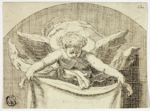 Agostino Veneziano made "Eros Stealing Man's Shield" using engraving techniques, resulting in a print now held at The Met. Immediately, the strong contrasts and the starkness of the black lines against the white paper is striking, creating a visual tension that draws the eye. The composition is dominated by the figure of Eros, who is playfully juxtaposed against the symbol of masculine defense, the shield. Here, the line becomes a tool for commentary, subtly undermining traditional symbols of power. Eros's plump form, rendered with meticulous detail, contrasts with the smooth, curved surface of the shield, hinting at the vulnerability beneath the armor. The use of line and form prompts us to question the values and categories typically associated with such symbols, inviting us to reconsider fixed meanings and embrace ambiguity in our understanding of power dynamics.