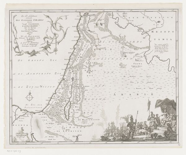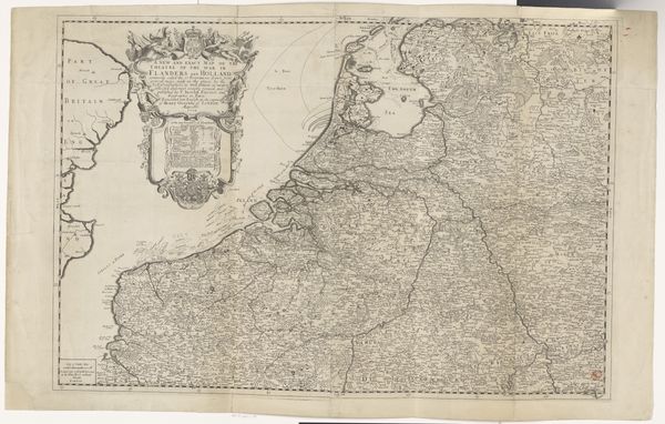 Curator: What a detailed creation. We're looking at "Kaart van de Republiek der Zeven Verenigde Nederlanden en een deel van het Heilige Roomse Rijk," or "Map of the Republic of the Seven United Netherlands and part of the Holy Roman Empire," an engraving by Carel Allard, dating from after 1680. It’s held here at the Rijksmuseum. Editor: Immediately striking is the precision of this piece. Look at the fineness of the lines! But the allegory… quite classical, quite imperial. Even for a republic, this feels like a projection of power, a carefully crafted declaration. Curator: Absolutely. The engraving style recalls older traditions of mapping as a form of statecraft. The cartouche at the top left isn’t merely decorative. Figures of justice, prosperity, military strength they speak to the aspirations and justifications of the Dutch Republic. Notice how they subtly dominate the geographic space. Editor: I see the desire for control, not only over the physical space depicted, but also the symbolic realm. Those classical figures almost sanctify Dutch ambitions, turning land into legacy. It's a Baroque display, but what is it trying to mask, or to further empower through an invented grandeur? Curator: The sea itself bears symbolic weight. Ships sail confidently and freely, showcasing Dutch maritime prowess, of course. Consider, also, the borders: quite clearly delineated, assertive. But there's always negotiation at play. The 'map' isn't merely recording, it's shaping how viewers perceive those borders, that sovereignty. Editor: Exactly! And consider how the land is presented. It’s not just geographic data; it's a claim. By detailing cities, rivers, and regions, the map makes tangible this abstract notion of ‘the Republic.’ But who is being represented in this vision? Whose stories are missing from this carefully constructed narrative of nationhood? Curator: A question worth asking, definitely. These historical maps, beautiful as they are, served very particular agendas. They're documents of power, revealing much about how societies wished to be seen – or to see themselves. Editor: It leaves me thinking about the weight we give maps even today – the narratives they reinforce, the spaces they overlook. This piece serves as a potent reminder of the stories maps tell, and crucially, those they intentionally leave out.
