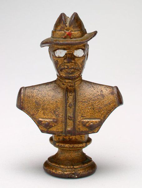 Editor: Here we have "-Coronation Bank", a bronze and metal sculpture created around 1953. It looks like a miniature crown, maybe a paperweight, or... well, a bank! What immediately strikes me is its intricate detail and somewhat aged appearance. How would you interpret this piece? Curator: Let's begin with the object itself. The patinated bronze, while suggesting age, also directs us to its materiality. The textures—the smoothness of the crown juxtaposed with the tufted base—create a tactile tension. Notice the formal symmetry, disrupted only by the presence of what appears to be a screw. Editor: Yes, the screw on the top! I hadn't considered it as a formal disruption. It does seem at odds with the rest of the crown's ornamental structure. Is there a meaning in that contrast, do you think? Curator: Precisely! This introduces a layer of semiotic play. The screw—a symbol of industry and utilitarianism—collides with the crown, which embodies power and tradition. Is it a subtle commentary on the diminishing authority of royalty in a modern age? Or could it indicate its functionality to extract your savings from a royal icon. The structural integrity is reinforced via the horizontal and the curve of the arc which contrasts with the hard edges of the base Editor: That’s fascinating. I was focused on its aesthetic value, but looking closer at its contrasting textures and that screw, I realize it provokes so many questions. Thanks for your insight into it! Curator: The close reading allows us to unpack those contrasts to consider historical change and societal structure of authority.