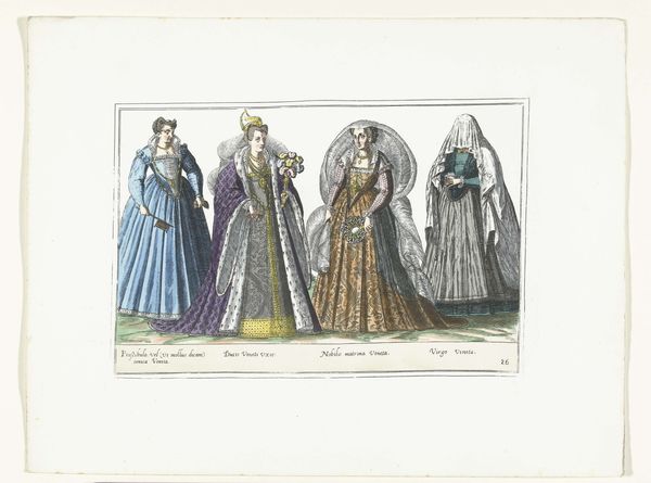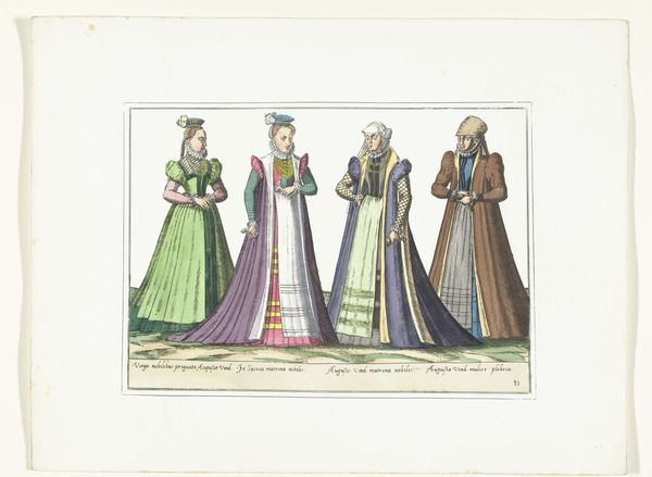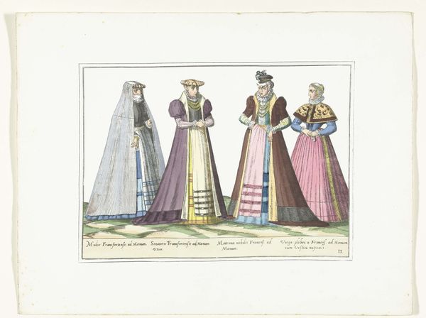 This print, made around 1580 by an anonymous artist, presents eight women dressed in the latest French fashions. Produced using engraving techniques, the designs are etched into a metal plate, inked, and then printed onto paper, with color added later. The material reality of these clothes speaks volumes. Sumptuous fabrics such as silk and velvet, rendered in rich colors, display the immense labor required to produce them. Consider the skilled weavers, dyers, and tailors involved, not to mention the global trade networks that brought these materials to Europe. The print highlights not just the aesthetic of French fashion, but also the social and economic structures that supported it. Each woman's elaborate dress broadcasts her status, a visual representation of wealth and power. In this way, the print transcends mere documentation, becoming a commentary on the era’s values and the complex interplay between fashion, labor, and social class. It reminds us that even seemingly superficial objects like clothing are deeply intertwined with the material conditions of their creation.