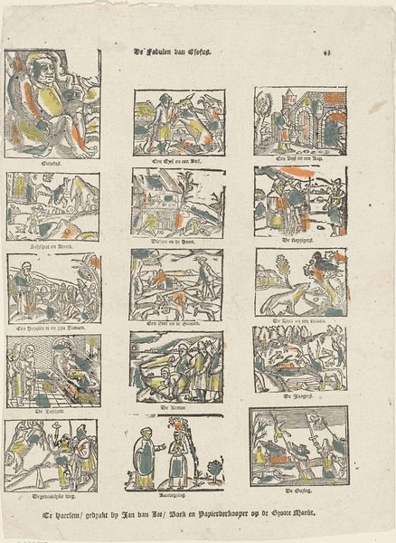 This sheet of printed images, Bybelsche Figuuren, des Ouden Testaments, was created by Jan van Lee, a bookseller and paper merchant in Haarlem. It is a woodcut, meaning that the artist carved away the negative space around the lines of the image, then printed the remaining raised areas. Woodcut is a relatively accessible method, requiring some skill but no specialized equipment. The bold lines and simplified forms are characteristic of the technique. Each image is a snapshot from the Old Testament, and the artist uses line and tone to convey a sense of drama. The addition of color, likely applied by hand, enhances the visual impact. Consider the labor involved: from the carving of the block, to the printing process, and the hand-application of color. These were all tasks performed by artisans, for a public eager to consume imagery, and the stories that went with them. By appreciating the making, we can see how these prints bridge the realms of art, craft, and commerce.