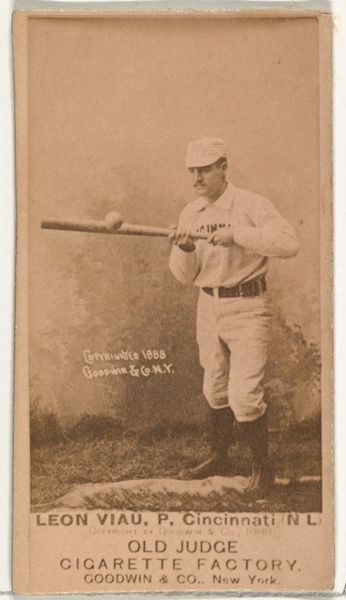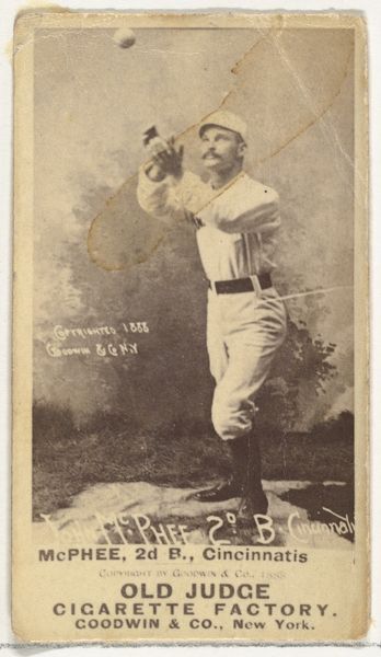 This is a baseball card from the Old Judge series, made in the late 19th century by Goodwin & Company. The sepia tones and compact size give the piece a nostalgic, intimate feel, as if holding a fragment of history in your hand. The composition is simple yet effective. A baseball player is captured mid-swing, positioned against a blurred background. The limited tonal range focuses our attention on the subject's form and action. The muted palette and soft focus lend the scene a dreamlike quality, elevating the ordinary to a level of timeless significance. Consider how the card's materiality—thin paper stock and mass-produced aesthetic—speak to the burgeoning consumer culture of the time. The baseball card functions as both a commercial product and a cultural artifact. It captures a moment in the sport, a fragment of time made available for circulation and exchange.