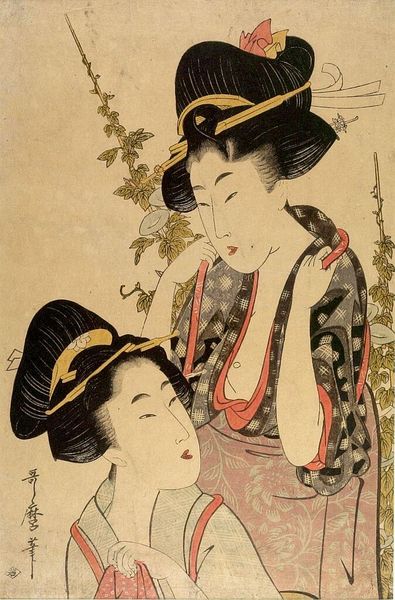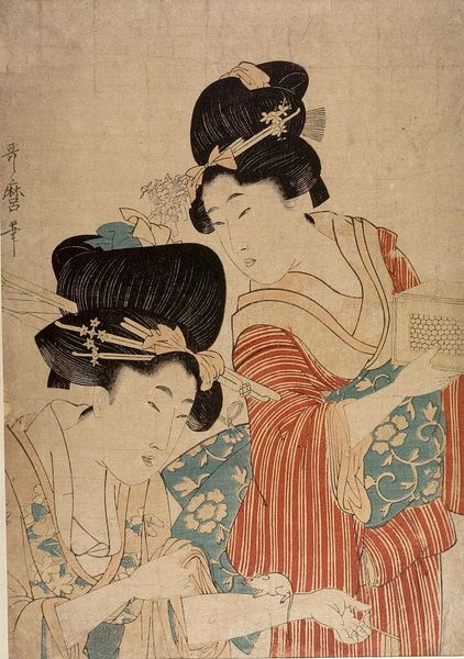 Curator: Here we have a Japanese woodblock print entitled "The Courtesan Tagasode of the Tamaya," crafted by Kitagawa Utamaro II. Editor: The color palette is soft, almost dreamlike. The figures seem to float on the paper, with a feeling of subdued elegance. Curator: Utamaro II, working within the ukiyo-e tradition, captured aspects of Edo period culture, often focusing on the lives and fashions of the courtesans. Editor: The attention to detail in the kimonos and hairstyles speaks volumes about the social and economic status of these women, highlighting the complexity of their position in society. Curator: Absolutely. The prints were a commodity, shaping public perception of these women and the pleasure quarters they inhabited. Editor: It also makes me consider the female gaze. How did these women view themselves versus how they were being viewed and consumed by wider audiences? Curator: That's a vital question. It's through understanding the historical context that we can begin to grapple with the complex issues of representation. Editor: It encourages us to look closer at the layers of meaning embedded within the artwork. Curator: Indeed. I leave with a deeper understanding of how cultural norms and power dynamics are reflected through art.