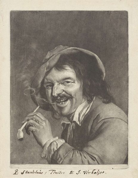 Adolph Kittendorff created this colour lithograph titled "En glad sømand" whose date is unknown, but the work is held at the SMK. The composition is dominated by the figure of a smiling sailor, set against a dark backdrop that throws his cheerful affect into sharp relief. Kittendorff's use of light and shadow not only sculpts the sailor's features but also directs our attention to the textures of his clothes and the gleam of his pipe, thus creating a dynamic visual experience. The choice of lithography introduces its own structural elements. The layering of colours gives depth to the image, while the inherent flatness of the print medium subtly emphasizes the constructed nature of the scene. The sailor’s obvious joy might initially appear straightforward, but consider the formal structure: the sharp contrasts and careful arrangement, creating a commentary on the construction of such imagery. Kittendorff masterfully uses form to prompt us to consider what structures underpin our understanding of joy.