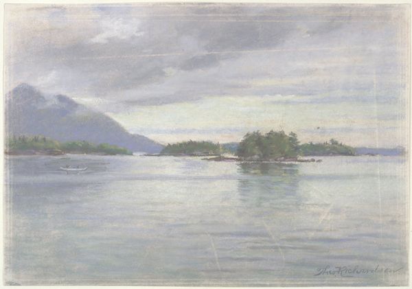Erastus Salisbury Field created this idyllic view of Leverett Pond using oil on canvas. The muted palette evokes a sense of tranquility, with the soft blues of the water and sky contrasting gently with the greens and browns of the landscape. Notice how Field divides the composition into horizontal bands: the foreground of grassy land, the tranquil expanse of the pond, and the distant, hazy mountain range. This layering creates a sense of depth and invites the eye to wander into the landscape. The placement of trees along the left edge and right side of the frame creates a sense of enclosure, like curtains framing a stage. But it's the flattened perspective that's most striking. Field seems less concerned with replicating reality and more interested in creating a harmonious arrangement of forms and colours. This flattening anticipates later modernist explorations of surface and form, disrupting traditional notions of landscape painting. The clouds and foliage are rendered with a simplicity that flirts with abstraction. Consider how the octagonal shape of the canvas contributes to this effect, further destabilizing conventional landscape expectations. This self-aware distortion challenges us to reconsider our perception and what it means to represent nature.