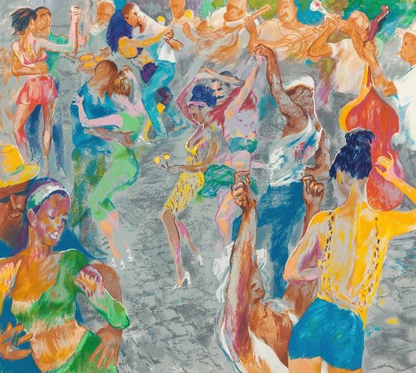 LeRoy Neiman made this painting, Aspen Mountain Rendezvous, using expressive strokes of bright oil paint. Neiman's technique, known for its spontaneity, captures the energy of the scene; the texture of the paint itself conveys the brisk air and the rush of the ski slopes. The canvas becomes a stage for a performance of color, applied with a verve that echoes the dynamism of the social scene he's depicting. Looking closely, we can see a crowd in the foreground, all rendered with the same energetic brushstrokes. The choice of oil allows for a depth of color and a richness of texture. Neiman, with his signature blend of art and reportage, immortalizes leisure and society. The sheer physicality of the paint embodies the spirit of the location, a nexus of wealth and recreation. This painting is a testament to how materials and making, and the social contexts in which these happen, profoundly shape our understanding of art.