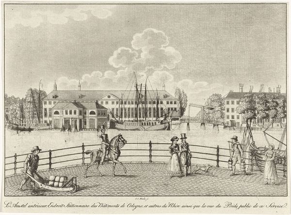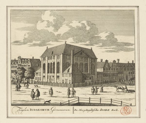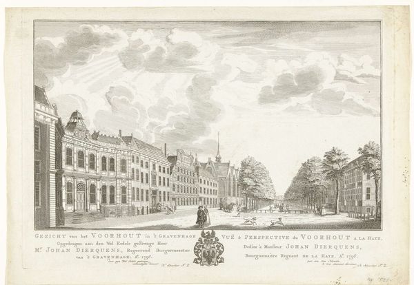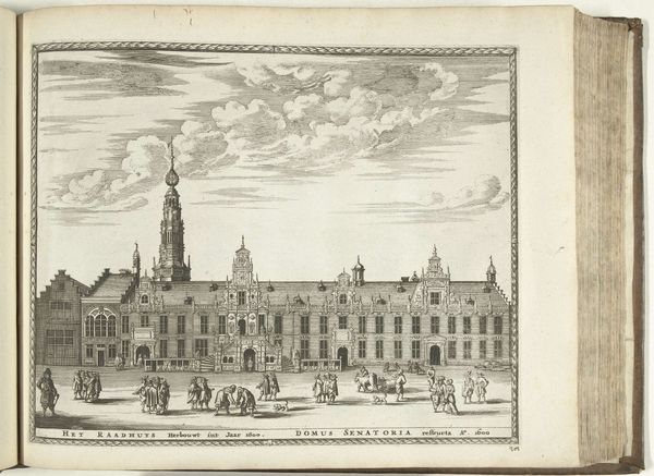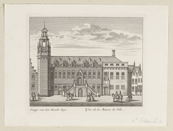 Curator: Here we have "Gezicht op het Binnenhof te Den Haag" by Pieter Schenk, an engraving dating from 1695 to 1705. It depicts a view of the Binnenhof in The Hague. Editor: Immediately, I'm struck by how much the etching relies on crisp, clean lines. The mood is formal, precise; everything appears very ordered and considered, almost theatrical in its staging. Curator: Indeed. The linear precision is crucial. As an engraving, the piece involves meticulous labor—careful carving into a metal plate, the physical act mirroring the precision it depicts. Consider how the marketplace was rapidly changing as artworks like this could be created more quickly, but also distributed widely. Editor: Absolutely. And I can't ignore the symbolic weight of this particular cityscape. The Binnenhof isn’t just any cluster of buildings, it's the heart of Dutch political power, the place where decisions are made. The gathering clouds, which almost seem to engulf the place, may imply turbulence or potential disruption, suggesting a sense of unease with established order. Curator: That tension could also be viewed materially. The crisp lines, produced through intense labor, highlight that the stability of Dutch power is constantly being maintained through social processes and people's work. It required labour to establish, and labor to maintain. Editor: Interesting perspective. I am inclined to see it more as Schenk's deliberate invocation of collective memory. For a contemporary viewer, this image resonates with shared ideas of Dutch authority, perhaps subtly questioned during a time of transformation. These images are less about "objective reality" and more about fostering shared sentiment. Curator: And such sentiments were materially driven, don't forget the prints must be circulated widely to cultivate that national feeling. That is what this production process permits: creating visual uniformity for cultural production on a grand scale. Editor: I think both views illuminate this complex cityscape by Pieter Schenk, don't you agree? Curator: I concur. Understanding the means and intention truly helps contextualize our perception.