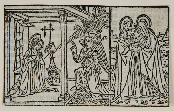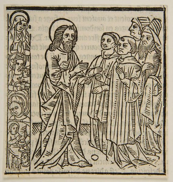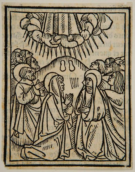 Curator: This engaging print, "Abraham, Sarah, and Isaac," presents a classic biblical narrative through a unique visual language. It’s part of the Harvard Art Museums collection, created by an anonymous artist. Editor: I’m immediately struck by its raw emotional quality, the stark lines carving out figures of almost desperate supplication. It feels so immediate. Curator: The texture suggests a woodcut, emphasizing its role in disseminating religious narratives to a broader audience. Think about the labor involved, the deliberate carving, and the potential for mass production. Editor: And yet, there’s something so intimate about it. The imperfections, the visible grain, they bring me closer to the story, the human drama within the religious text. Curator: Exactly. The materiality connects us to the historical context, reminding us of the artwork's function as both a religious object and a product of its time. Editor: It's more than just a religious lesson; it's a reflection on faith, sacrifice, and the complex relationships within a family. It really stirs the imagination.