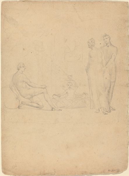 This drawing, "Antik figurscene" by Wilhelm Marstrand, presents a scene rendered with delicate pencil strokes on paper. The composition centers on a kneeling figure, possibly in supplication, counterbalanced by two standing figures. The architectural form to the right anchors the subjects, giving a sense of classical antiquity. Marstrand's use of line is economical, yet it effectively conveys the emotional weight of the scene. The structure is defined by a series of vertical and horizontal lines, creating a grid-like structure which could be seen to represent the moral and ethical framework governing the figures’ actions. It invites us to consider how classical ideals influence human behavior and social structures. The subtle texture of the paper adds depth, while the blank space to the right is not merely empty; it acts as a semiotic void, inviting contemplation and projecting the emotional landscape of the scene beyond its immediate depiction.