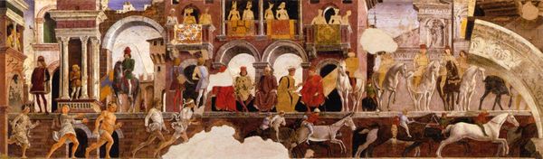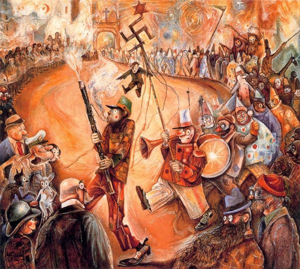 Curator: Diego Rivera’s sweeping mural, "The History of Mexico," painted in 1935, engulfs us in a complex narrative. You can find it on the walls of the Palacio Nacional in Mexico City. What strikes you first about this epic scene? Editor: The density. It’s a whirlwind of figures, almost overwhelming in its scale and detail. There's a powerful sense of dynamism, but it's also slightly chaotic. Is there a formal structure tying all these historical vignettes together? Curator: Rivera uses this density to mirror the layered and often turbulent history of Mexico itself, the piece serves as a visual testament to the country’s revolutions and struggles, specifically critiquing the socio-political impacts of colonialism and celebrating indigenous resistance. The composition intentionally juxtaposes eras and social strata. Editor: I see it now, with distinct registers stacked vertically. The top section featuring figures representing various periods post-colonization with characters in positions of power contrasted against those who fought against subjugation in the central portion, all supported by a bloody foundation filled with the literal casualties of war. Note Rivera’s distinctive bold use of color – it directs the eye and enhances the narrative’s emotional impact. Curator: And Rivera wasn't afraid to challenge the ruling classes, right there within the halls of government. The mural became a public declaration of his political convictions. Its creation transformed the space into a battleground of ideas. Editor: Looking at it purely aesthetically, there's this deliberate contrast between the chaotic foreground and the relatively calmer, more ordered figures in the upper levels. Rivera cleverly guides our eye, even though the painting is packed with information. The cannon positioned left of center divides the piece creating a feeling of rising action. Curator: Absolutely, he makes visible the narratives usually repressed or distorted by the dominant discourse. The artwork fosters discussions around social justice, inequality, and the very meaning of Mexican identity in the 20th century. Editor: The History of Mexico, beyond its political message, demonstrates Rivera's brilliant ability to synthesize historical moments, stylistic complexity, and emotional depth. He's really commanding our gaze here, isn't he? Curator: Absolutely. Rivera masterfully challenges viewers to question established norms and confront the historical complexities that shaped the nation. Editor: A powerful demonstration of how form and context intertwine. Definitely leaves an indelible mark.