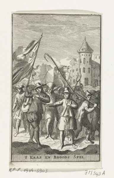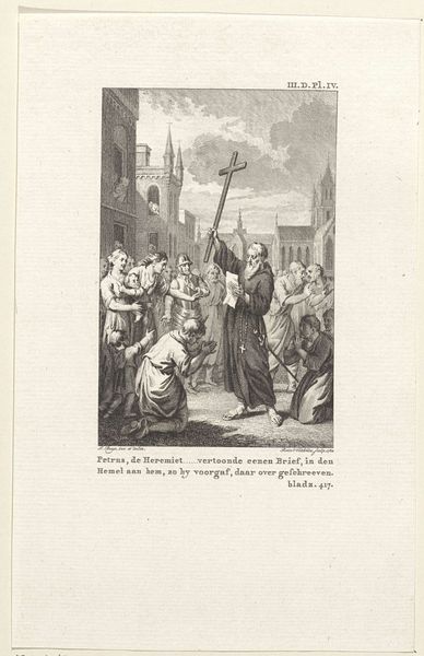 Curator: Pieter van den Berge's engraving, made around 1700 to 1702, titled "Aankomst van de bisschoppen Willibrord en Wilfridus in Vronen in 698," depicts the arrival of Bishops Willibrord and Wilfridus in Vronen. Editor: The scene feels so formal and a little bit stilted. There's this dramatic kneeling figure and stiff-looking bishops. Everything feels very posed, despite presumably depicting a 'real-life' arrival. Curator: Absolutely, that rigidity speaks volumes. This piece belongs to a larger visual culture aimed at solidifying religious narratives. The power dynamics here are unmistakable: the act of kneeling demonstrates submission to the church's authority and divine mandate. Editor: And what’s intriguing is how the image seeks to naturalize that power. Placing these bishops centrally in the frame, elevating them, with attendants and a castle, contributes to constructing a visual representation of power. The kneeling person seems a supporting cast. Curator: Precisely! Consider that the image isn’t just representing an historical event, it actively constructs a specific interpretation of it, a message amplified through its baroque stylistic elements. Editor: Tell me more, it’s really interesting… Baroque, even in print, suggests a conscious decision to employ persuasive tactics. Beyond just documentation, it feels propagandistic. This image invites viewers to consider their roles in religious power dynamics. Are we, in a sense, also kneeling before this history? Curator: The placement of the image matters too. In what publication did it appear? Who was the audience? What socio-political function did it fulfill? These are vital questions we should address. Editor: And what does this 'arrival' truly signify? Are these colonizers? Conquerors? There are serious ethical implications embedded here concerning religious and cultural imperialism. It's never *just* an arrival, is it? Curator: No, it rarely is. This work offers insight not only into art historical depictions of religious figures but also into our continued, urgent engagement with those themes. Editor: Indeed. Thinking critically about such narratives, considering perspective and motivation – this engraving is far more relevant to us today than perhaps one might initially imagine.