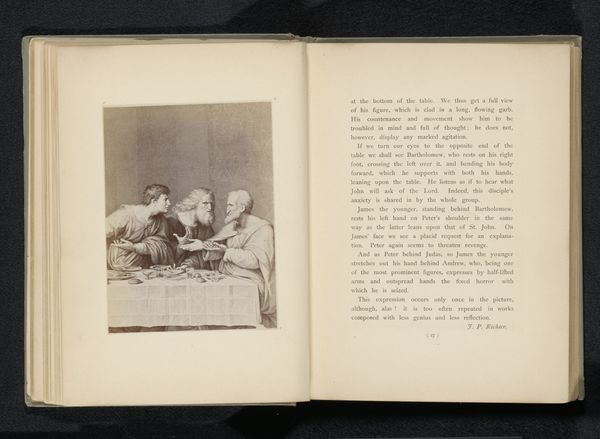 Editor: Here we have a photogravure of William Mulready's painting, "The Whistonian Controversy," dating to before 1880. It gives such a sense of contained drama in this small space. I'm immediately drawn to the central argument, but also the domestic setting... what do you make of its impact? Curator: It’s fascinating how this domestic interior stages an intellectual debate, particularly considering the historical context of the image's reception. Look at the visual cues: the concentrated figures, the clutter of scholarly papers. This reproduction makes visible the 19th-century’s fascination with scenes of intellectual and theological disputation and invites the viewer into a world of debate. How do you think that access changed the meaning of the work? Editor: Well, before photography, this scene would have been accessible to fewer people, right? Being able to disseminate this image so widely democratized the conversation to a degree. It also reframes the initial intent from documentation to debate. It sort of moves from recording this scene to a prompt for one’s own views on the discussion in the painting, don't you think? Curator: Exactly! And consider the rise of academic art at this time. Etchings such as this contributed to defining artistic canons and values by circulating idealized narratives of learning and erudition throughout broader society. They solidified cultural values, reinforcing notions of scholarship as an exclusive domain but accessible enough to emulate. How would such scenes impact social values around class or gender at the time, with its display in a bourgeois home? Editor: That’s a great point. The image is not just about the academic discussion. The presence of a woman at the door, even in the background, underscores the domestic setting which reinforces ideas around gender. So, while seemingly celebrating intellectualism, the piece reinforces those historical limitations as well. Thank you, that really adds depth! Curator: It's these subtle power dynamics, often revealed through accessible imagery, that continue to make works like these relevant for studying the complex politics of visual representation and cultural messaging.