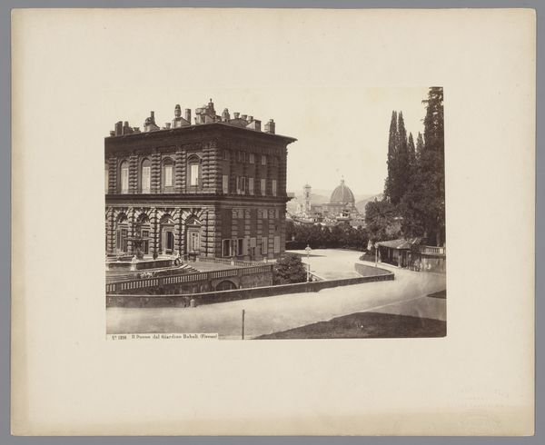 Editor: So, this is a photograph, a gelatin-silver print from between 1865 and 1881, by Giacomo Brogi. It’s called "View of the Santa Croce and the statue of Dante in Florence, Italy". There’s a certain stillness, a posed formality to the composition that makes it feel almost like a stage set. What catches your eye in this piece? Curator: My gaze is immediately drawn to the figure of Dante, elevated, yet integrated within the broader urban landscape. He's a symbol, not just of Florence, but of language, of Italian identity itself, and of course, of immense cultural significance. How does his positioning – in front of, but also slightly to the side of Santa Croce – strike you? Editor: It’s interesting...almost like two distinct eras are facing off. The church represents established religion, and Dante… well, his writing challenged established norms, didn't it? Curator: Precisely. Notice how the facade of Santa Croce, meticulously captured, showcases an idealised version of Renaissance order and faith. Brogi is offering us more than just a pretty picture; he's setting up a symbolic dialogue between the earthly and the spiritual, the ancient and the… well, relatively modern. And, considering the Risorgimento was ongoing during this period, wouldn't you agree that a powerful sense of Italian nationalism could be present in such photograph? Editor: Yes, I see it now. Placing Dante, a literary hero, in the foreground against the backdrop of such a historically significant church...it definitely speaks to a burgeoning sense of national pride. Something more than just documentation. Curator: Indeed! The photographic medium, in its apparent objectivity, often conceals a deeper subjective intent, revealing underlying cultural narratives and aspirations. Even in what seems like a simple landscape. I leave it with you. Can you really tell which came first for Giacomo, the setting of Santa Croce, or Dante's statue? Editor: Thanks. Thinking about symbols and cultural context really shifts how you see an image.