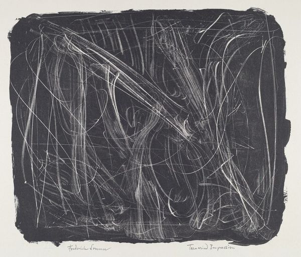 Editor: This is Bernard Childs’ 1955 etching titled *Frumenti*, also known as *Propulsion*. Looking at it, I see a dark, almost chaotic energy, like particles colliding in space. The composition feels dense and restless. What sort of imagery or symbolism strikes you? Curator: The title *Frumenti* is intriguing. It derives from *frumentum*, the Latin word for grain, and this suggests ideas about origins, nourishment, and abundance, and maybe even a sort of violent propagation of new life. Do you see that potential tension between darkness and creation? Editor: Yes, definitely! The marks almost look like seeds scattering or some kind of explosive growth against that deep black backdrop. So, is the medium, etching, adding anything to this? Curator: Absolutely. The etched lines, so fine and yet so insistent, create a web of association. Consider how the abstract expressionists grappled with anxieties in the atomic age by expressing primal energies with an immediacy of gesture. Does that context change how you interpret the mark making here? Editor: It does, it makes me think about atomic structures. Knowing that *Frumenti* is also titled *Propulsion*, do you think these symbols represent scientific notions about progress? Curator: Perhaps, but it could also be about the psychological effect that that era had on our shared unconscious, which can manifest through archetypal imagery and mark-making in any medium. Does this provide an emotional and cultural layer for you? Editor: Yes! It’s amazing how a seemingly abstract work can carry such a load of meaning. I am really inspired by this work to think about the multiple ways to relate symbolism with a social setting. Curator: Absolutely! Hopefully you can begin to unpack layers of symbols and emotional baggage with this new tool.