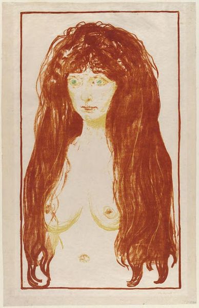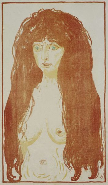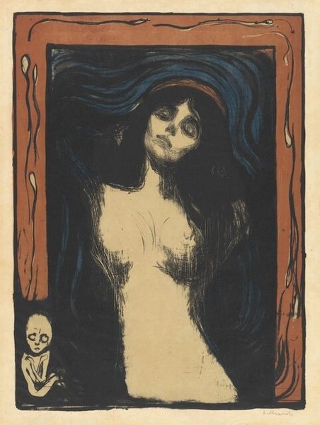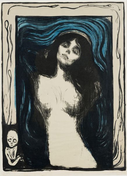 Editor: This is Edvard Munch's "Madonna," a print housed here at the Harvard Art Museums. The swirling lines and stark contrast create a powerful, almost unsettling mood. What strikes you about the formal aspects of this work? Curator: The lithographic technique allows for a remarkable tonal range, does it not? Note how Munch manipulates line and shadow to create depth and a sense of enveloping darkness, which both isolates and elevates the figure. Editor: It’s interesting how the figure seems both vulnerable and powerful, especially with the fetus-like figure in the corner. Curator: Precisely. The embryonic form introduces an element of semiotic tension, juxtaposing creation and vulnerability. The artist uses these visual elements to disrupt conventional representations. Editor: I see it now, how Munch's technique reinforces the complex themes he's exploring. Curator: Indeed, it is in the formal elements that Munch communicates his radical vision.