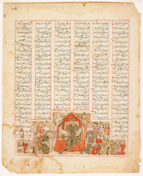 Curator: Just look at this. It's mesmerizing. We're gazing at "Caesar Makes a Talisman," a folio plucked from a Shahnama, or "Book of Kings." Created sometime between 1305 and 1365, it resides at The Met, a beautiful dance of ink, watercolor, and paper. Editor: The talisman seems like the only thing missing—ironic for something said to possess magic. I am struck by how the palette conveys a strange blend of regality and foreboding, what do you think? Curator: Totally! The careful composition and the almost dreamlike wash of colors absolutely contribute to that tension. Look at the minute details! That incredibly fine linework and those gorgeous washes! It speaks to me about craft, time, the preciousness of storytelling. I almost feel a responsibility to carry this story on somehow. Editor: Exactly. And within these intricate details lies a complex interplay of power dynamics. Consider Caesar, embodying authority, and the act of crafting a talisman itself. It is an emblem of control and perhaps a comment on the construction of legitimacy through belief systems and ritual practices. Note that even with its vibrant colors, it retains a flattened perspective. Curator: Absolutely. And beyond the socio-political dimensions, I think it hints at the human condition, too. The desire to shape destiny, the lure of protection. The incompleteness suggests that all efforts toward perfection are flawed, unfinished, as it speaks volumes about the ever-elusive nature of security and the vulnerabilities inherent to those in power. I also detect elements of melancholy here… a sense of something forever just out of reach. Editor: I can appreciate that; it’s interesting you see melancholy, I detect hubris and possibly even violence in the pursuit of certainty—as that pursuit frequently reinforces hierarchies of power. Overall, it's difficult to come away from this with a positive aftertaste, a point which really resonates today. Curator: And in this lies the folio’s magic, in how a seemingly simple historical scene is rife with enduring questions about power, safety, and human fallibility, the search for stability amid the ever-changing tides of existence. Editor: Definitely food for thought. It’s a powerful reminder that what we believe is really the source of power, not the objects themselves.