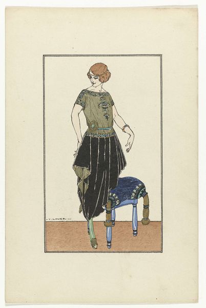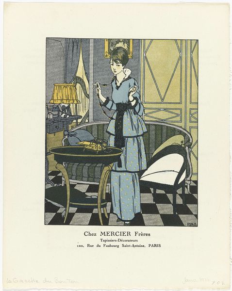 Curator: Immediately, I’m drawn to the texture, even on a digital reproduction. The way the artist has handled what appears to be color printmaking is quite beautiful, particularly the fabric folds on the central figure's dress. Editor: Let’s take a closer look. This print, entitled "Gazette du Bon Ton, 1914," showcases an advertisement for Mercier Frères, a Parisian tapestry and decorating firm. What I find striking is how it embodies a specific cultural moment in Paris, just before the outbreak of World War I. Curator: The Art Nouveau influences are undeniable, particularly in the sinuous lines of the furniture and the decorative elements. It’s clear the production and printing processes themselves – the physical labor – would have been intensive to get this layered effect. There's an implicit tension between its intended function as advertising and its aspiration towards “high art.” How did these advertising images function as a reflection of wider visual culture? Editor: That’s precisely the historical tension I'm interested in! Periodicals such as the "Gazette du Bon Ton" played a key role in disseminating taste and projecting Parisian style. Advertisements, like this one, functioned not merely as calls to purchase but as curated expressions of a lifestyle. We're not simply selling furniture; we’re selling access to the exclusive world represented in this print. Curator: Looking again at this, I am reminded of textiles and upholstery, not only because that is what the company offers, but because you can feel it. The furniture seems to speak of its materials and techniques, as the company obviously saw labor as craftsmanship that aligned itself with the tastes of Parisian society. Editor: Indeed, notice how the advertisement avoids portraying the Mercier Frères workshop itself. The image presented to the viewer emphasizes the final product placed in a domestic setting; the labor involved is effectively concealed behind a veneer of refined taste and style. I am curious: in what ways does its presentation challenge traditional hierarchies between ‘high art’ and commercial production? Curator: Well, looking at the lines that articulate material as much as it describes its form, the labor involved might actually blur boundaries between craft and art here. And in its mass-production, we are seeing art in a new type of consumable culture that art could influence. Editor: Absolutely, and in this way, the piece tells us something about the role of these printed publications in constructing social status and in the role of commerce and its impact in Parisian society in the early twentieth century. Curator: Seeing it within this historical perspective deepens our appreciation for its nuances, going far beyond simple appreciation of form. Editor: Precisely; it also adds to my interest as a historian to understand this kind of artistic production in defining Parisian and French identities on the world stage, by establishing criteria and aesthetics for cultural consumers.