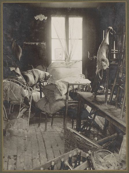 Curator: This photograph, by Frances Benjamin Johnston, bears the title "Races, Negroes: United States. Virginia. Hampton. Hampton Normal and Industrial School: Agencies Promoting Assimilation of the Negro. Training Negro Girls in Domestic Science. Hampton Normal and Agricultural Institute, Hampton, Va.: Scrubbing." Quite a mouthful! Editor: My immediate impression is one of constrained energy. The figure, hunched and absorbed, seems to be pushing against the very frame of the image. It speaks volumes about labor. Curator: Precisely. Look at how Johnston uses light and shadow to emphasize the repetitive nature of the task. The bucket, the cloth, the posture—it's all so deliberately framed. One might consider the symbolism inherent in 'cleaning up'—an attempt to assimilate an entire race through domestic training. Editor: That's the crux of it, isn't it? Domestic science isn't merely about skills; it's about assigning roles, defining labor. What materials are used here? Wood floors, a basic bucket – the bare necessities to maintain a certain status quo. This speaks of the consumption and perpetuation of social boundaries. Curator: It's a stark piece, really. Johnston, whether intentionally or not, captured not just an image, but a loaded narrative about race, labor, and the complexities of assimilation. I feel sorrow and fury. Editor: And isn’t that what compels us? Its ability to distill such a complex history into one quietly powerful image.