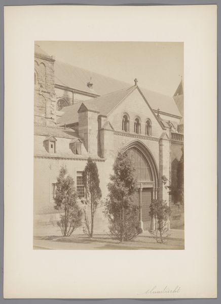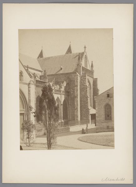 Curator: Let’s consider this photographic print, “Gezicht op de archiefgebouwen aan het Abdijplein van de Abdij van Middelburg,” placing us before the archive buildings at Middelburg Abbey, captured after 1906 by C. Aubry Fils. What strikes you immediately? Editor: Well, that's quite a mouthful of a title! Jokes aside, there's a palpable sense of… gloom. I’m getting historical vibes; all those soaring towers casting shadows. It looks serious. Does it feel serious to you? Curator: I see what you mean. I think the gravitas of the image connects directly with the Abbey’s historical role—its place as a site of religious and political authority through the centuries is written in its architectural language. The absence of bustling crowds, the lone figures... that silence feels heavy. Editor: Heavy indeed. I wonder about those lone figures you mentioned. Are they going about important business? Maybe the somber tones of the image make it hard to really imagine. It's all greys and browns; the antithesis of vibrancy. I can see where the abbey buildings stand. Why highlight them? Curator: Aubry, in a way, memorializes institutional memory through architecture. The archive building housed important records and deeds—legacies, even— of prominent families and local government. So this image functions, in part, as a statement about historical power structures and who gets to write that history. This relates to concepts of spatial justice and representation within archives. Editor: Ah, so we're really talking about power dynamics being built into the very stones here, in this image as well. Like the very buildings are trying to look imposing! The photographer obviously also found it of significance. This image really makes you think, huh? About legacy, who creates it, who's in charge... Curator: Precisely. Aubry Fils allows us a lens to dissect those narratives encoded in the stones—narratives often excluding or misrepresenting marginalized communities. It encourages a visual interrogation into whose stories are centered, and whose are silenced, within these historical and architectural behemoths. Editor: A silence that's deafening now that you point it out! Gosh, I was just struck by the light and dark when I began, but you really gave me so much to ponder about the social context and deeper layers woven in, don't you think? Thank you for your insight! Curator: You've shifted my perspective as well. Paying more attention to what my intuitive responses say has definitely improved how I analyse works, especially after considering how certain historical contexts influence our perspectives. It has really helped in my line of work. Thank you!