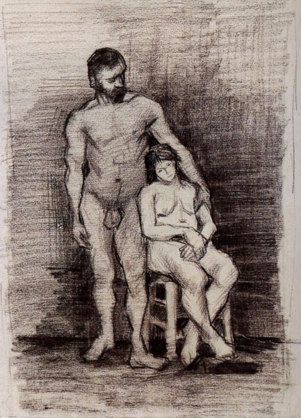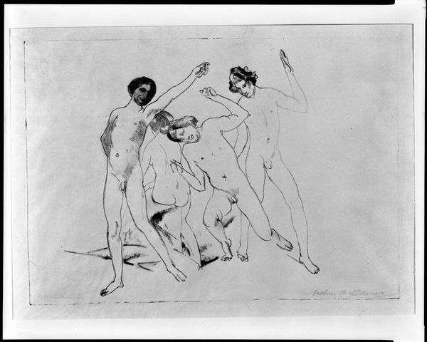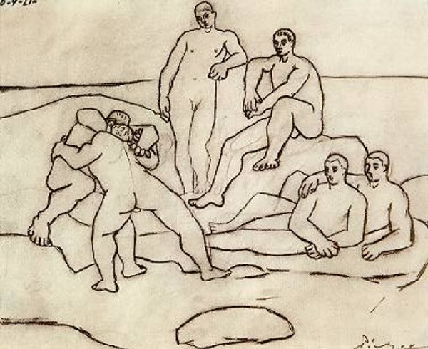 Editor: This is "Composition with Five Nudes, Standing Figures" by Othon Friesz, created sometime between 1905 and 1908. It looks like a charcoal and pencil sketch, and I find its unfinished quality really intriguing. What strikes you most about this piece? Curator: Well, what jumps out at me is the tension between the classical subject matter and the modern, almost raw execution. Nude figures were a staple of academic art, often imbued with allegorical or mythological meaning. Friesz, though, seems to be deliberately undermining that tradition. Editor: How so? Curator: Look at the sketchiness, the lack of idealization. These figures are rendered quickly, almost crudely. It challenges the prevailing academic style that was endorsed by institutions and powerful art critics. The drawing pushes against established artistic hierarchies and their power. This raw, expressive style reflects the rise of modernism. Editor: So, it's a statement about artistic freedom? Curator: Precisely! It’s asserting the artist's right to depict the human form without adhering to the established norms. And, of course, such artistic choices are inherently social and political statements as they critique established societal norms. This artwork becomes a rejection of the artistic status quo, claiming the artist's independence. Do you see any echoes of classicism despite the stark modern features? Editor: I guess the figures’ poses feel a bit classical. But I mostly notice the deliberate rejection of that polish. Curator: And that tension is where the real meaning lies, wouldn't you agree? The drawing underscores a desire to move beyond traditional constraints. Editor: Definitely. I never considered how radical a simple sketch could be! Now I am more curious about Friesz' influences and the reactions this artwork provoked. Curator: Absolutely, it shows how deeply art is always embedded in social context.