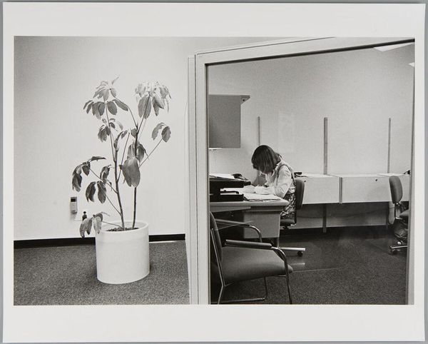 Editor: This photograph, "Untitled (man sitting at window in office)" by Jack Gould, shows a man looking out at an airplane. The overall mood seems quite contemplative and still. What do you see in this piece? Curator: It's fascinating how Gould captures this mid-century corporate setting. The man, the airplane, the very design of the office; they all point to an era of rapid technological advancement and perhaps, anxieties about the future. What role do you think photography played in shaping public perceptions during this time? Editor: I suppose it offered a seemingly objective view of progress and its impact. Thanks, I hadn't thought about the societal anxieties reflected here. Curator: Indeed. It's in these subtle details that photography reveals its power as a social and historical document.