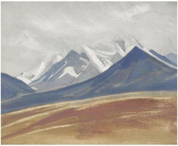 Nicholas Roerich captured this view of the Himalayas, using tempera on canvas. The composition divides the landscape into horizontal bands, creating a sense of vastness and serenity. At the top, a muted sky blends into the snow-capped peaks. Notice how Roerich employs a limited palette, focusing on blues, grays, and whites to evoke the cool, ethereal atmosphere of the mountains. The peaks are stylized, almost geometric, reducing the landscape to its essential forms. Roerich’s use of line and color suggests not just a physical place, but a symbolic space for spiritual contemplation. The repetitive, rhythmic arrangement of the peaks suggests a deeper structure, perhaps echoing the repeating patterns found in nature or the mantras of spiritual practice. The painting destabilizes our conventional understanding of landscape, inviting us to see beyond the surface to a more profound, underlying order.