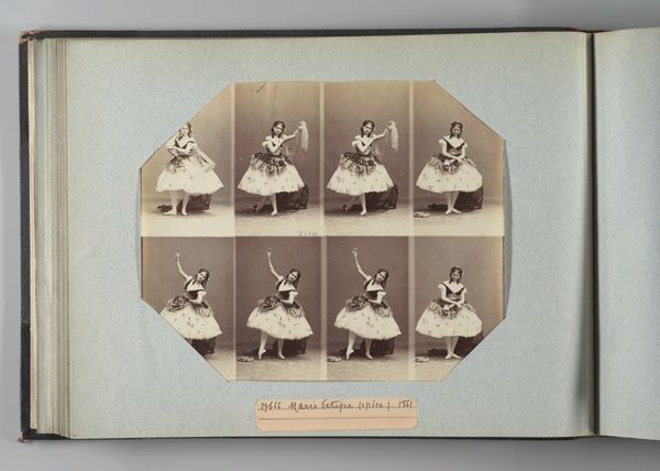 André-Adolphe-Eugène Disdéri captured Clara Pilvois using the innovative carte-de-visite format around 1862. Disdéri patented this technique, which allowed for multiple poses to be captured on a single plate, drastically reducing the cost of portraiture. This democratization of image-making coincided with a rising middle class eager to participate in visual culture. In this staged photograph, Pilvois's identity as a woman of means is carefully constructed. Her elaborate gown, styled hair, and the neoclassical props that surround her speak to a performance of femininity and status. The multiple exposures offer a narrative, yet each pose remains static, reinforcing the controlled and idealized representation of women in the 19th century. While Disdéri's invention opened doors for broader access to photography, consider the ways in which it also standardized representations, reinforcing societal norms around gender, class, and identity. The image evokes a sense of both access and constraint, reflecting the complex social dynamics of the era.
