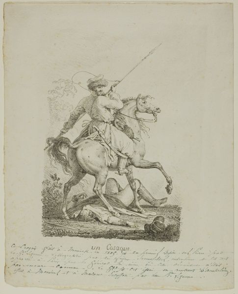 Eugène-Louis Lami created this print, "Moncey, Ex-colonel of the 3rd Hussar Regiment," using etching. At its heart, this artwork encapsulates the figure of the horseman, a symbol resonating through the ages. The equestrian figure extends back to antiquity, embodying power, nobility, and martial prowess. From the Roman equestrian statues to Renaissance depictions of kings on horseback, this motif consistently signifies leadership and control. Yet, here, we see the colonel, not in active battle, but as "ex," a title that adds a layer of complexity. His uniform is elaborate, and the horse prances, yet the scene evokes a sense of past glory. Consider the psychological weight of the image: the horse and rider as a unified entity, a display of mastery over nature, and a connection between man and animal that touches our primal instincts. This image invites us to reflect on the cyclical nature of power, the ephemeral quality of glory, and the echoes of past grandeur in the present.
