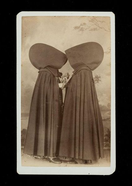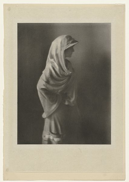 Editor: So, here we have Irving Penn's gelatin silver print, "Two Guedras, Morocco," from 1971. It’s quite striking, almost spectral. There's something haunting in how the figures are draped. What do you see in this piece? Curator: Immediately, I'm drawn to the complex intersection of cultural representation and artistic agency in Penn's work. These Guedras, or veiled women, present us with layered questions about visibility, anonymity, and the gaze. It challenges us to consider how Western artists like Penn engage with, and sometimes exoticize, non-Western subjects. Who are these women beyond the veil? And what does it signify within their cultural context versus Penn's artistic interpretation? Editor: So, it's not just about the aesthetic of the photograph, but also about power dynamics? Curator: Precisely. The act of photographing itself involves power. Penn, as a Western photographer, is capturing these women, framing their image for a Western audience. We have to ask, are these women empowered or objectified by this representation? Is Penn offering a commentary, or simply perpetuating orientalist tropes? How do you read their body language? Is there a sense of defiance, of resilience? Editor: I see what you mean. It makes me question my initial interpretation and consider the implications of seeing these figures outside their cultural context. There is indeed something both compelling and problematic about this photograph. Curator: And that tension is precisely what makes it a powerful, albeit complicated, artwork. It encourages critical thinking about representation, cultural exchange, and the artist’s role in shaping our understanding of "the other." This photograph invites a deeper exploration of its historical and social context. Editor: Thank you! That's a totally different approach than what I had initially thought about when simply observing the image! Curator: These historical images are incredibly evocative starting points to further question today's societal context.