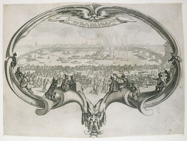 Robert Bonnart created this print of a fan, using etching on paper, in the late 17th or early 18th century. The image depicts a festive event on a river, likely in Italy, judging from the inscription, with crowds of people gathered to watch. This print offers insight into the social life and entertainment of the European elite. The scene suggests a carefully orchestrated public event, designed to display power and wealth. It speaks to the importance of spectacle in early modern European culture, and it provides an opportunity to consider the role of the artist in representing and promoting the interests of the ruling classes. Further research into the specific historical context of the depicted event, including the location, the occasion, and the individuals involved, would allow us to understand more fully the social and political dynamics at play. Prints like these serve as valuable historical documents, offering insights into the values, beliefs, and social structures of past societies.