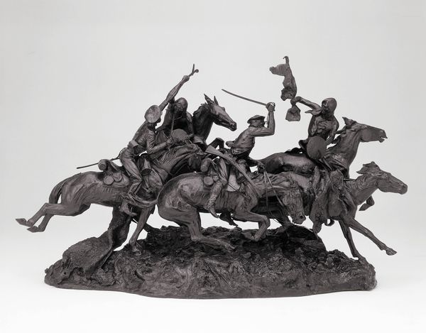 Curator: Take a look at Frederic Remington’s “The Scalp Lock,” rendered in bronze, sometime after 1898. It's currently held here at The Art Institute of Chicago. Quite a piece, isn't it? Editor: Wow. Intense. The raw emotion, that defiant pose...it hits you right away. Dark, brooding, feels almost like a scream frozen in metal. Curator: Exactly. The figure on horseback, presumably a Native American warrior, is brandishing a scalp lock. Remington’s choice to immortalize that moment speaks volumes, I think. He captures the climax of conflict, or perhaps its aftermath. Editor: A complex symbol, that scalp lock. Beyond conquest or trophy, it is about power: appropriation of identity, erasure. Consider the horse too - a link to spiritual or shamanic practice - Remington positions this liminality poignantly between victory and sacrifice. Curator: And you feel the motion, right? Remington wasn't just presenting a static scene; he was trying to convey action, drama, almost cinematically. The way the horse is posed... It’s like time suspended just for us. Editor: That rearing stance, all energy and controlled power – but there's something tragic too, in that arrested movement. The realism is deceptive; there's a heightened, almost operatic feel, especially in the warrior's face. And a deep ambivalence given the legacy of Manifest Destiny... Curator: Do you get the sense that this piece seems aware of its place in a larger narrative about the West and its mythologies? That Remington is using his own biases or cultural baggage to reflect back at the viewer? Editor: Absolutely. It's not a simple depiction; it's an invocation of archetypes, both romantic and disturbing. And the darkness of the bronze adds to the drama. It reflects and distorts simultaneously, creating almost an accusatory mirror of cultural memory. Curator: Makes me ponder on a personal note what artistic integrity really looks like. Because Remington must have known that works like this walk a line… and perhaps, just maybe, it was meant to unsettle. What does art ask of us in moments of change? Editor: Right! Its lasting value is it demands we grapple with it rather than admire it; so it reflects something unresolved, un-cauterized in the American psyche, as much as it tells us anything about the man that sculpted it.