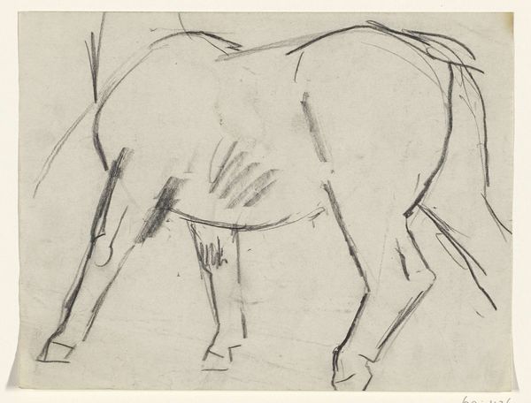 Curator: Leo Gestel's "Grazende Koe," or "Grazing Cow," created sometime between 1891 and 1941, presents a figure in the landscape drawn with pencil on paper. What are your initial impressions? Editor: The piece feels incredibly sparse and raw. Just a few pencil strokes really capture the bulk and weight of the cow. There's something vulnerable in its simplicity. Curator: Gestel, in this drawing, positions a cow, typically a figure of agrarian life, in a way that almost abstracts its form. We need to consider the socioeconomic context—how was the idealization of rural life being deployed, and who benefitted from this imagery? Editor: You’re right to call attention to the cultural construction of the "rural idyll.” Was it truly experienced equally across gender, race, and class? Gestel’s choices here feel interesting in the way that the cow is stripped back to its essence. He is suggesting something deeper. Is he critiquing or celebrating the animal's purpose? Curator: Gestel's body of work went through phases heavily impacted by movements like luminism and expressionism. I think the reduction of the cow to fundamental lines and forms might signal a step toward abstraction, moving beyond mere representational depictions and touching something essential, perhaps its animality, outside any social hierarchy. Editor: Perhaps its “cowness,” not just “cow-as-property.” The looseness in style does suggest movement; its neck bowing downward into the implied grass is quite palpable. But I'm wondering about the missing context. Is it grazing freely, or is there a tether unseen? Those kinds of power dynamics can play on a scene even when invisible. Curator: The Rijksmuseum holds this drawing, amongst his many other drawings and paintings. Gestel became an important figure in the Dutch art scene, especially his treatment of landscapes. In our moment, the idea of what that landscape offers—ecologically and sustainably— becomes much more charged, beyond nationalistic framings. Editor: Absolutely. Looking at Gestel's study now makes you wonder what we expect, and extract, from our surroundings— and whose voices have dominated those historical accounts. Curator: Exactly. It becomes imperative to interrogate these idyllic images to reveal more complex stories around how land, labor, and beings get represented, or erased, across artistic representations. Editor: Thanks to Gestel for prompting this dialogue, intentionally or otherwise, through such economic means.