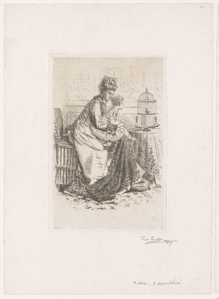 Curator: Right, let’s take a look at Constant Aimé Marie Cap's "Child with Mother on her Lap Looking at a Birdcage on the Table." It's an engraving, dating back to 1883. What are your immediate thoughts? Editor: It's strikingly still. A captured moment. Something about the precise linework gives a feeling of suspended time, or maybe of preservation. The soft rendering adds this feeling of nostalgia... and look at the bars on that birdcage. What about freedom? Curator: Ah, yes, the cage! An apt visual metaphor, of course, for the societal constraints placed on women and children in that era. But then again, isn't there a strange sense of domestic security also in the piece, a kind of contented entrapment? Editor: It is complex, because this scene could read differently for a mother or for the little child. If we delve deeper into the imagery, birds often symbolize the soul, transcendence, but in a cage... a soul stifled? Or protected, as you mentioned. The cage itself feels very prominent in the composition; very visible. Curator: It's certainly intriguing how Cap places that birdcage almost at eye level with the child, inviting the gaze, but also drawing a symbolic link between them. Makes you wonder, doesn't it? Did they have caged canaries in those days? What does it say about Cap's view of the role of the mother at the time, is there also a subtle restriction for women too in her dress and home? Editor: I find myself pondering what happens outside this frame. Are those fine crisscross markings a way to suggest all the external influences pushing inward? And where does that young gaze linger, beyond the cage and outside? Curator: These domestic scenes of daily life were typical in this period; but often masked social critique and insights regarding class and family hierarchies. It gives pause to observe how familiar such issues remain more than a century later. Editor: It does, doesn't it? A beautiful image opens into something unheimlich, or uncanny; that peculiar strangeness of seeing something familiar suddenly cast into the dark corners of social history.