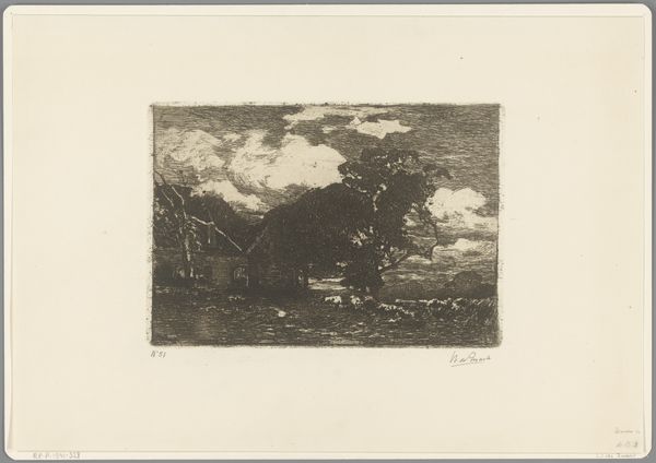 Editor: Here we have Charles-Francois Daubigny's "L'Ondée," an etching printed on paper. The date of its creation is unknown. It depicts a shepherd and their flock, and I find the limited use of blacks and whites creates a somber, almost monochromatic, effect. The composition directs your eye to the center horizon line, where the shepherd walks. What elements of this work stand out to you? Curator: The composition, without a doubt, is the initial focal point. Notice the strategic placement of the dark tones that create depth within the restricted tonal range. Observe how the horizon line both bisects and connects the earth and the sky. The artist's skillful deployment of etching, especially with the horizontal lines and use of light, encourages the viewer to navigate between the various textures created. How does the contrast between the sky and field textures strike you? Editor: The textures, though simple, almost create two separate worlds within one plane. One is busy and the other looks soft like clouds. Curator: Precisely. We see this pictorial balance echoing classical landscapes, yet the overt simplicity hints toward more modern sensibilities. It exemplifies Daubigny's focus on depicting the mundane elements of nature in the purest formal structure. I am particularly drawn to the contrast of line and shading and the juxtaposition that makes you want to enter the open horizon and expansive sky. Are you equally compelled by the composition, even while acknowledging its seemingly simplistic appearance? Editor: I see that now! I appreciate how analyzing the artistic techniques adds layers of depth to even a seemingly simple piece like this. Curator: Absolutely. The formal elements speak volumes once we learn how to listen to the conversation among composition, technique, and materials.