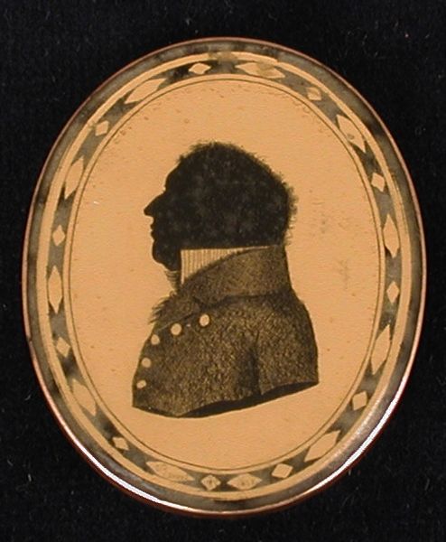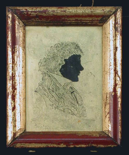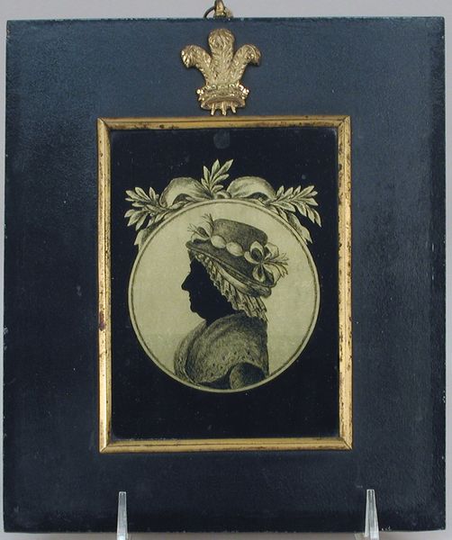 Curator: Here we have "Portrait of a Man," a drawing made around 1795. It’s currently held at the Metropolitan Museum of Art. What's catching your eye about this, as you look at it? Editor: Well, initially, the stark contrast. It's like a shadow caught in a gilded cage, all formality and hidden depths. Very compelling. Curator: Yes, that high contrast silhouette was a very popular format. This is neoclassical portraiture, after all, so the goal was to idealize the subject. Notice how the laurel wreath framing the profile nods to classical antiquity and suggests importance, status, maybe even military prowess given his uniform. Editor: Military, definitely! He's got that proud, upturned nose that probably scared someone on a battlefield once or twice. It's interesting how much they can convey with just a simple outline. There is very little information, but I fill it with information myself about him. Does that make sense? Curator: Absolutely, and that interplay is entirely intentional. Silhouette portraits were far cheaper and quicker to produce than painted portraits. This made them accessible to a wider audience and democratized image production. So you get that striking style coupled with wider circulation in society. It’s about representation and accessibility. Editor: Hmmm…the shadow as a symbol. That simplicity and mystery combined with accessibility must have made these little portraits so desirable. There’s a feeling like anyone could become history. That little embellishment up top on the black frame almost has a royal air. I bet that added to the feeling that everyone could ascend. Curator: That frame certainly elevates the portrait, doesn't it? It reinforces this sense of the individual's importance. It would be interesting to research where it originally hung and how it circulated among this man's peers. Editor: Now that’s the historical analysis at work! My mind mostly runs toward that anonymous shadow. Looking at it, I find myself projecting all sorts of narratives. That man could be a poet, a soldier, a dreamer lost in the march of time. Curator: Exactly! And the portrait serves both as a record of a life and an invitation to imagine it anew, filtered through history, art, and our own perspectives. It shows art’s role as an active record, in shaping history, shaping memory, shaping imagination. Editor: Indeed. From stark silhouettes to endless stories.