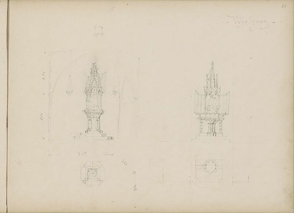 Curator: What immediately strikes me about this drawing is its ethereal quality, a faint, ghostly rendering in pencil on what looks like aged paper. There's a lightness, a certain fragility to the lines. Editor: Indeed. This is a study of "Altaar, Deurningen," an altar in Deurningen, Netherlands, executed in pencil by Pierre Joseph Hubert Cuypers between 1857 and 1859. Cuypers was a leading figure in the Gothic Revival movement, so this drawing provides a crucial window into his design process and historical inspirations. The fact that it remains a preliminary sketch highlights the blend of the historical influence of Medieval Art on architectural design in the 19th century. Curator: Yes, and if you look closer you'll notice some hand drawn fading typography in the centre as well, giving you that sketchbook impression and enhancing its ephemeral feel, doesn’t it? A suggestion of a space rather than a fully realised depiction. Editor: Precisely. Cuypers, known for his role in designing numerous churches and public buildings, positioned himself firmly within the currents of 19th-century historicism. His work can be examined as a manifestation of broader societal shifts like rising nationalism and the Church's influence. His preference to use the language of Gothic architecture connects to ideas about the golden age of the Dutch Middle Ages. Curator: I can see your point about how this drawing acts as a social object, although the composition is still foremost in my mind: how he's balanced these strong verticals with suggestions of that enveloping arch, for example. The sketch appears incomplete and it almost enhances the spatial dynamics of this austere space. The precision in some parts accentuates how loosely defined the composition is. Editor: An unfinished sketch also speaks volumes about the realities of architectural production in that era. This type of drawing was less a presentation piece and more an instrument of thought, pointing to its circulation in a workshop setting perhaps, rather than a gallery. Curator: You are right, I was maybe caught in its pure aesthetic appeal. All these considerations enhance how fascinating it is. Thanks for shedding light on the socio-historical significance of the sketch! Editor: It works both ways. Thank you for focusing my attention on the beauty inherent in the technique itself. A richer experience overall, considering both viewpoints.