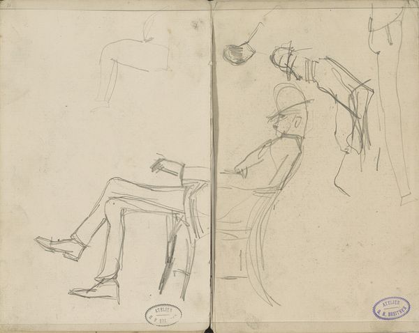 George Hendrik Breitner made these figure studies, including one of a seated man, with graphite on paper. It's a decidedly unfussy choice of material. Paper and graphite are workaday supports, available to anyone. The artist's labor is quite evident here. You can see in the figure’s postures—bending over or sitting wearily on a stool—that Breitner was concerned with the physical presence of his subjects. Graphite allows the artist to make quick marks and capture fleeting moments, but at the expense of color and richness. The choice to depict these figures, perhaps workers, with such modest materials suggests a deliberate artistic decision. Rather than glorifying the subjects with lavish materials or meticulous detail, Breitner’s sketch captures the dignity of labor and the essence of everyday life. The focus on making, materials, and context helps us appreciate the social significance of this simple yet powerful work.